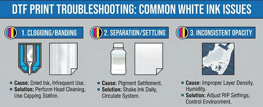 White ink is essential for vibrant prints on dark fabrics, but it can sometimes cause headaches. Here’s how to tackle the most common problems:
