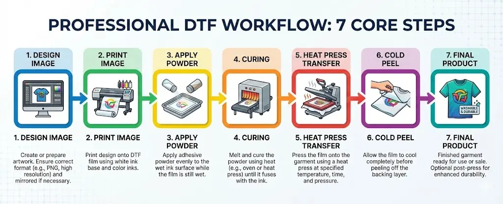 To get consistently professional results in DTF printing, you need to follow a clear workflow. Here are the seven core steps every operator should know: