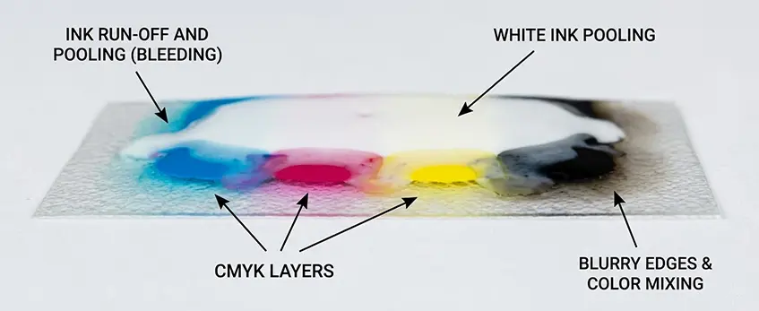 Ein häufiges Problem bei weißer DTF-Tinte für Tintenstrahldrucker ist das Auslaufen der Tinte in die CMYK-Schichten, was zu Verwischungen und Farbmischungen führt. Dies macht sich in der Regel durch unscharfe Ränder oder verwaschene Drucke bemerkbar, die detaillierte Druckvorlagen ruinieren können.
