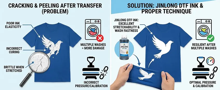 Um dies zu beheben, verwenden Sie Jinlong DTF-Tinte ist ein kluger Schachzug, da es eine hervorragende Dehnbarkeit und Waschechtheit bietet. Das bedeutet, dass die weiße Tinte auch nach mehreren Wäschen elastisch und intakt bleibt. Neben der Qualität der Tinte sind die richtige Einstellung des Drucks und die Kalibrierung der Bügelpresse entscheidend. Zu viel oder zu wenig Druck kann die Haftung der Tinte auf dem Stoff beeinträchtigen und im Laufe der Zeit zu Rissen oder Ablösungen führen.
