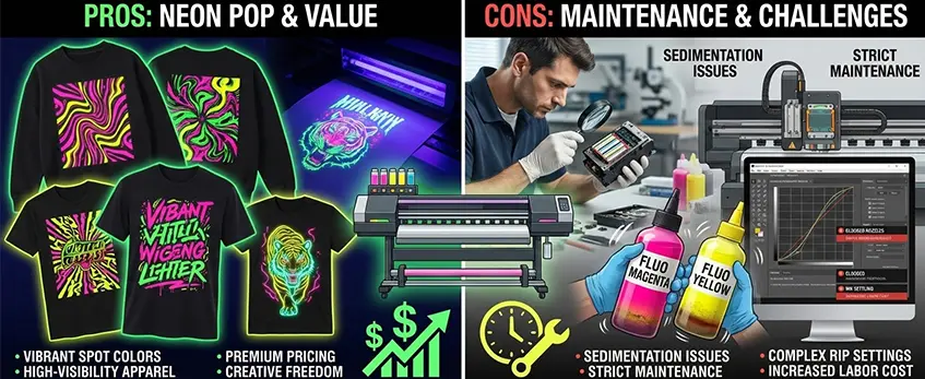 Nachfrage der Kunden spielt hier eine große Rolle. Wenn Ihr Markt - z. B. Premium-Streetwear oder UV-reaktiver Textildruck - nach neonfarbener DTF-Drucktechnologie lechzt, ist eine Investition in Fluo-Tinte und kompatible Geräte sinnvoll. Wenn Ihr Kundenstamm jedoch an Standardfarbpaletten festhält, ist der ROI möglicherweise nicht so hoch.