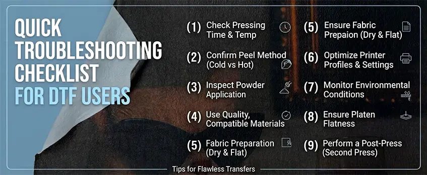 Wenn Ihr DTF-Transfer nicht klebt, kann eine klare Checkliste zur Fehlersuche Zeit und Frustration sparen. Befolgen Sie diese Schritt-für-Schritt-Diagnose, um häufige DTF-Haftungsprobleme zu erkennen und zu beheben: