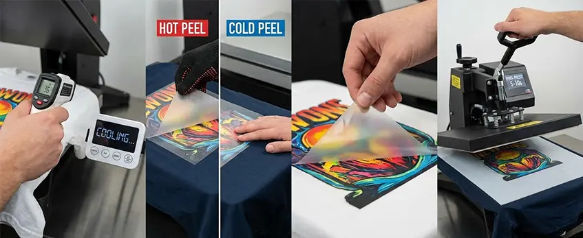 Nach der Übertragung durch die Wärmepresse ist die Abkühlungsphase entscheidend. Sie müssen wissen, ob Sie mit Heißpeeling vs. Kaltpeeling PET-Transferfolien machen den Unterschied aus. Für Cold-Peel-Folien, müssen Sie warten, bis die Übertragung vollständig abgekühlt ist, bevor Sie sie abziehen. Wenn Sie zu früh abziehen, besteht die Gefahr, dass sich die Tinte ablöst und Ihr Druck ruiniert wird. Auf der anderen Seite, Hot-Peel-Folien können sofort geschält werden, solange sie noch warm sind, was den Prozess beschleunigt.