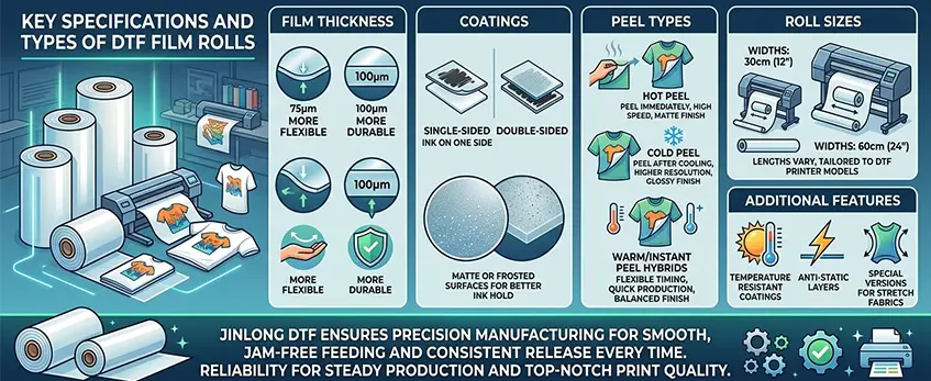 DTF film rolls come in various options to fit different printing needs, offering flexibility and durability. Here’s a quick look at key specs: