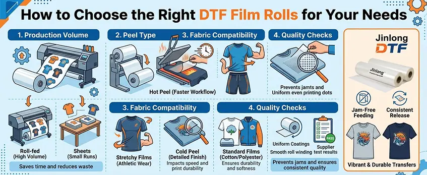 Picking the right DTF film rolls comes down to knowing your production style, fabric type, and finish expectations. Here’s a quick guide: