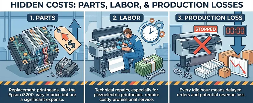 - Lost Production: Every hour your printer sits idle equals orders delayed and potential revenue lost.