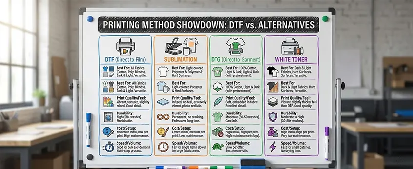 Comparing the Alternatives: DTF vs. Sublimation, DTG, and White Toner