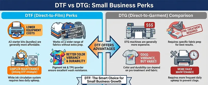 • Simpler maintenance: DTF printers with a white ink circulation system, like those from jinlong DTF, require less daily upkeep compared to DTG machines.
