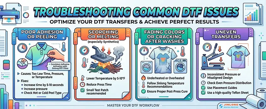 Colors fading or cracking often means the transfer was either underheated or overheated. Underheating results in poor curing, while overheating can damage the film’s surface. Stick close to jinlong DTF temperature recommendations and ensure a proper post-press cure for durability.