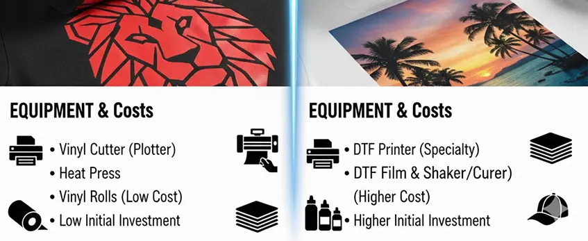 When comparing DTF vinyl printers to HTV setups, equipment and ongoing costs are key factors to consider for your custom apparel projects.