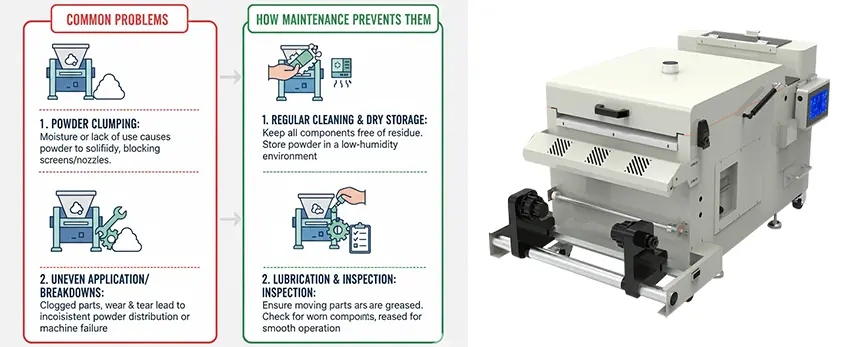 Keeping up with regular maintenance helps stop common issues that can shorten your DTF powder shaker’s life and hurt print quality.