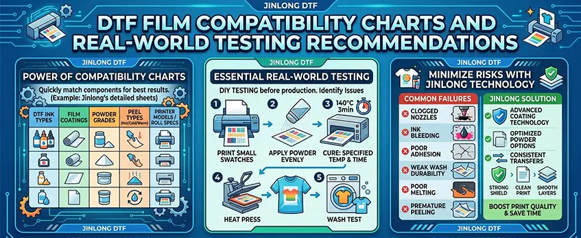 Entre los fallos más comunes se encuentran la obstrucción de las boquillas, la mala fusión del polvo o el desprendimiento prematuro de la película. Los productos DTF de Jinlong están diseñados con tecnología de recubrimiento y opciones de polvo que minimizan estos riesgos, garantizando transferencias uniformes. Seguir estos pasos de prueba de forma proactiva y consultar las guías de compatibilidad puede ahorrar tiempo y mejorar significativamente la calidad de impresión.