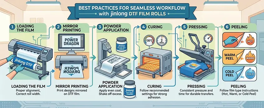 Para sacar el máximo partido a tus rollos de película jinlong DTF, es fundamental seguir un flujo de trabajo fluido. Aquí tienes una sencilla guía paso a paso para que tus impresiones sean nítidas y tu proceso eficiente:
