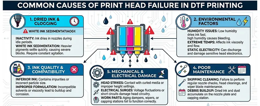 Print head issues are a big headache when running DTF printers, especially if you’re aiming for sharp, vibrant prints. Here are the most common culprits behind print head failure: