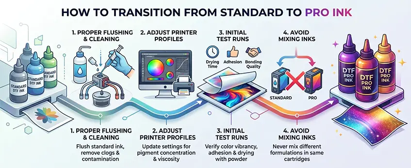 Switching from standard DTF ink to DTF Pro ink takes a bit of care to get the best results and avoid printer issues. Here’s a simple guide to make the transition smooth: