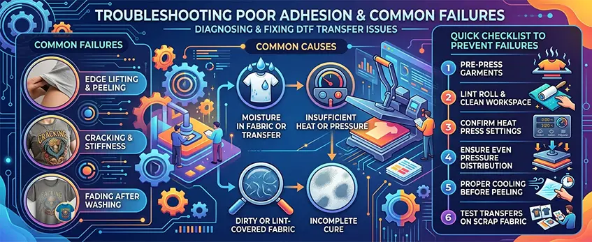 Several factors influence DTF adhesive bonding and overall transfer durability: