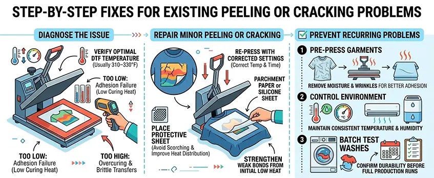 If you’re dealing with DTF transfer peeling after washing or print cracking causes, start by diagnosing the issue with a fresh test run on your heat press. Use a reliable thermometer strip or an IR gun to check if your temperature falls within the optimal DTF heat press temperature range (usually 310–330°F). This will help identify if your current settings are too low, causing low temperature DTF adhesion failure, or too high, leading to overcuring DTF transfers brittle issues.