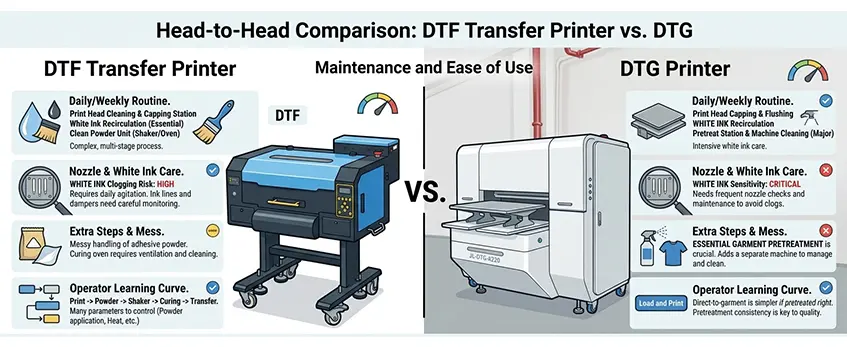 When it comes to maintenance and ease of use, both DTF transfer printers et DTG machines come with their own challenges and advantages that impact daily operation and reliability.