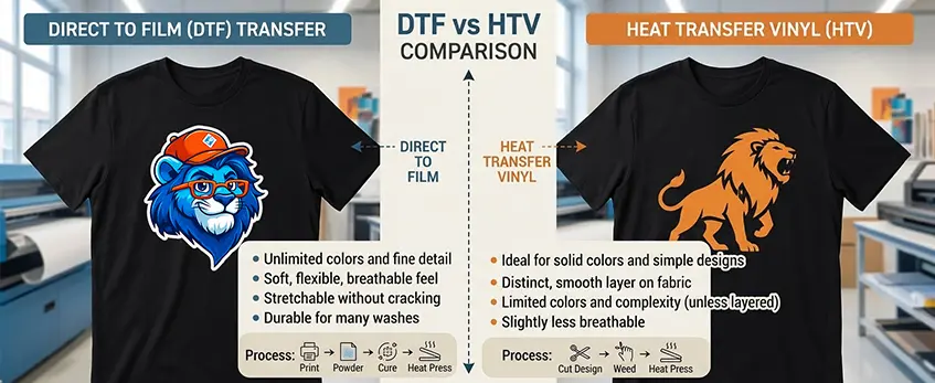 | Fonctionnalité | Vinyle à transfert de chaleur (HTV) | Direct-to-Film (DTF) |