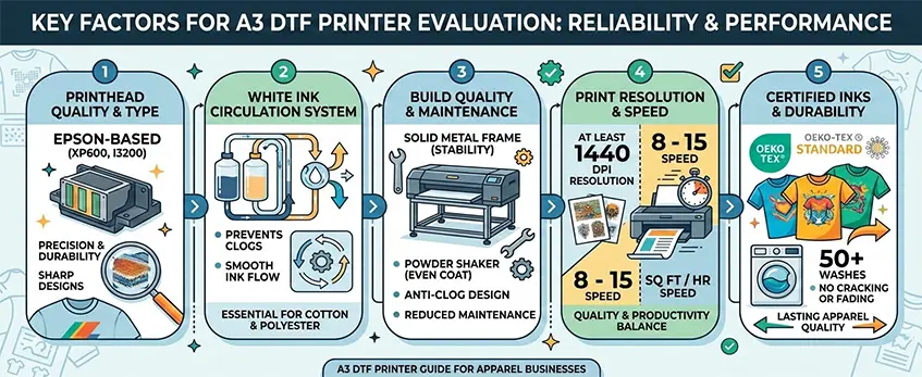 Look at printhead type (Epson-based DTF printer A3 models tend to be more dependable), white ink circulation systems, build quality, print resolution, and speed. Make sure the specs match your business needs.