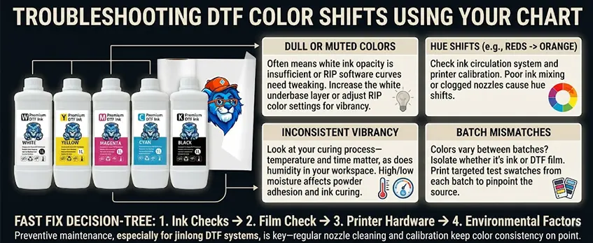 For a faster fix, follow a simple decision-tree approach: start with ink checks, move to film, then printer hardware, and finally environmental factors. Preventive maintenance, especially for jinlong DTF systems, is key—regular nozzle cleaning and calibration keep color consistency on point.
