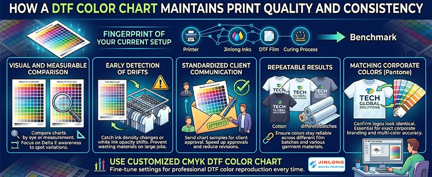For example, when matching exact corporate Pantone colors, the chart confirms your multi-color logos look identical across various fabrics and orders, preventing costly mismatches. Using a customized CMYK DTF color chart also helps fine-tune your RIP color settings tailored to your jinlong DTF inks and film for professional DTF color reproduction every time.