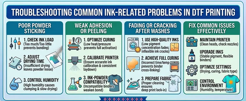 Low-quality DTF ink often results in a weak ink-powder interface. This causes poor grip on the fabric, making prints prone to peeling, cracking, or delaminating after washing. These adhesion failures are clear signals that the ink can’t support the powder or resist fabric movement.