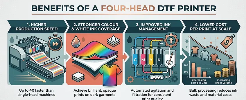 When comparing 4 head DTF printers vs 2 head models, the advantages become clear: