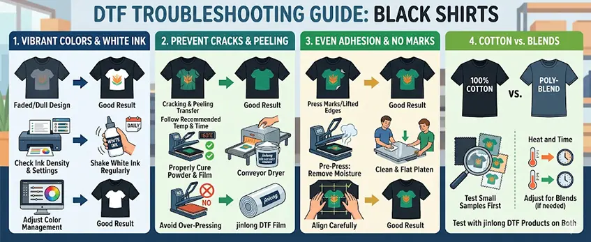 Maintaining softness and brightness also depends on the quality of jinlong DTF powder and film used, so pairing good materials with these care steps gives you professional DTF results on black apparel every time.