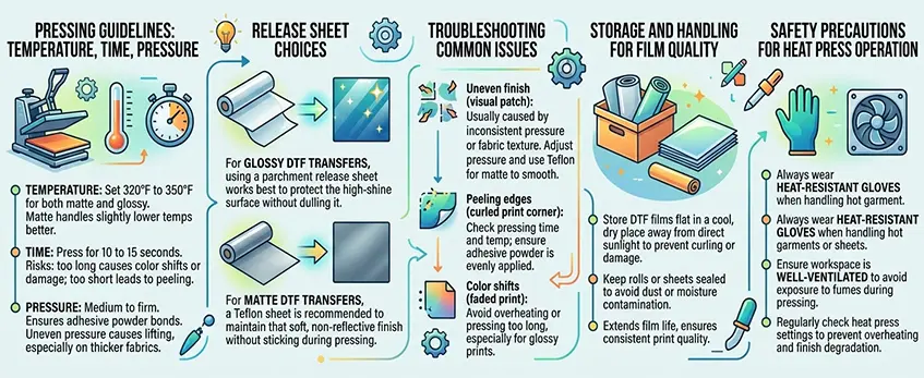 - Temperature: Set your heat press between 320°F to 350°F for both matte and glossy DTF transfers. Matte films often handle slightly lower temps better, reducing shine without sacrificing adhesion.