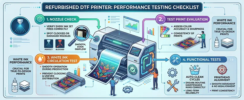 Before buying a refurbished DTF printer, thorough performance testing is key. Start with a nozzle check to ensure every ink jet fires correctly—this helps spot clogged or damaged nozzles that affect print quality. Next, request a test print evaluation to see real-world output. Pay close attention to colors, sharpness, and especially the consistency of the white ink performance, which is crucial for true-to-design prints. White ink often causes issues like clogging or uneven distribution, so ask for a white ink circulation test DTF to verify smooth operation during a full production run.