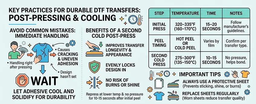 Adding a second cold post-press step improves transfer longevity and appearance. After the initial press and peel, place the garment back under the heat press at a lower temperature and no pressure for about 10–15 seconds. This step evenly locks the design in without risk of burns or shine.